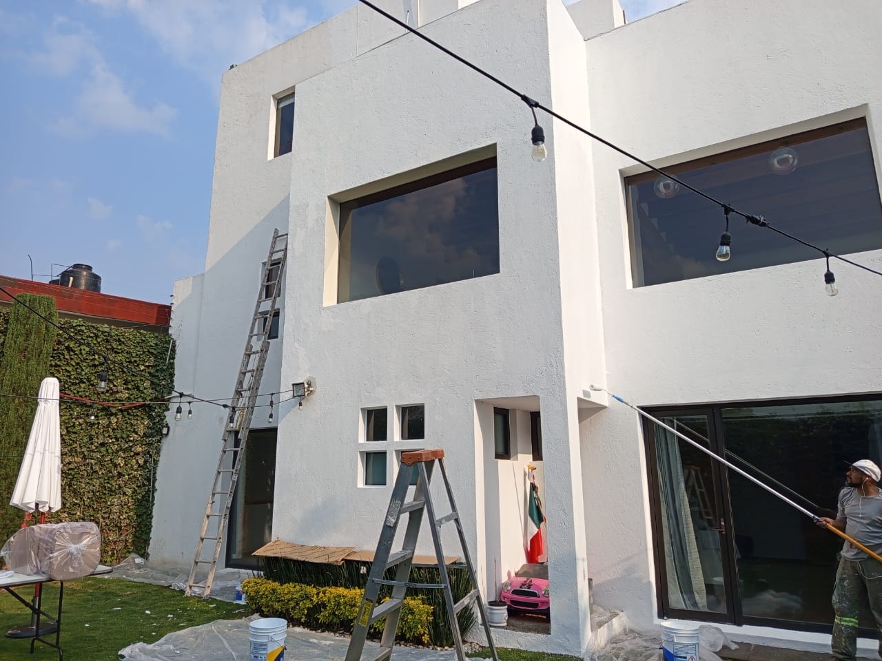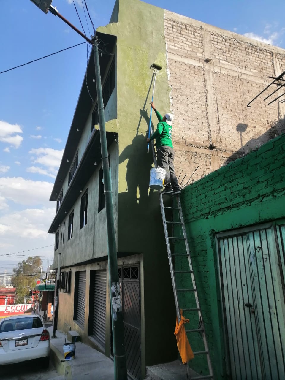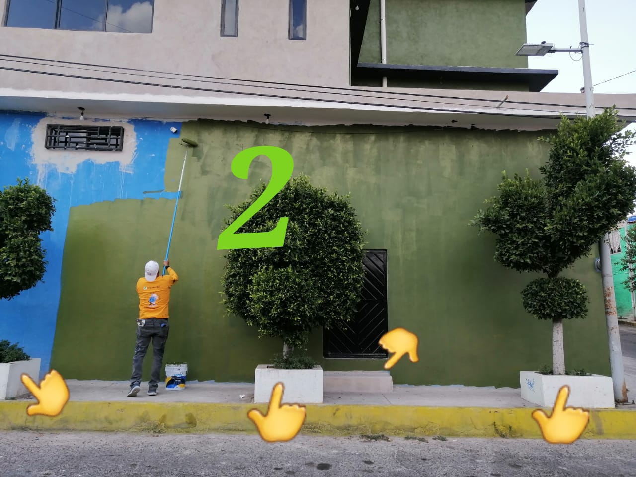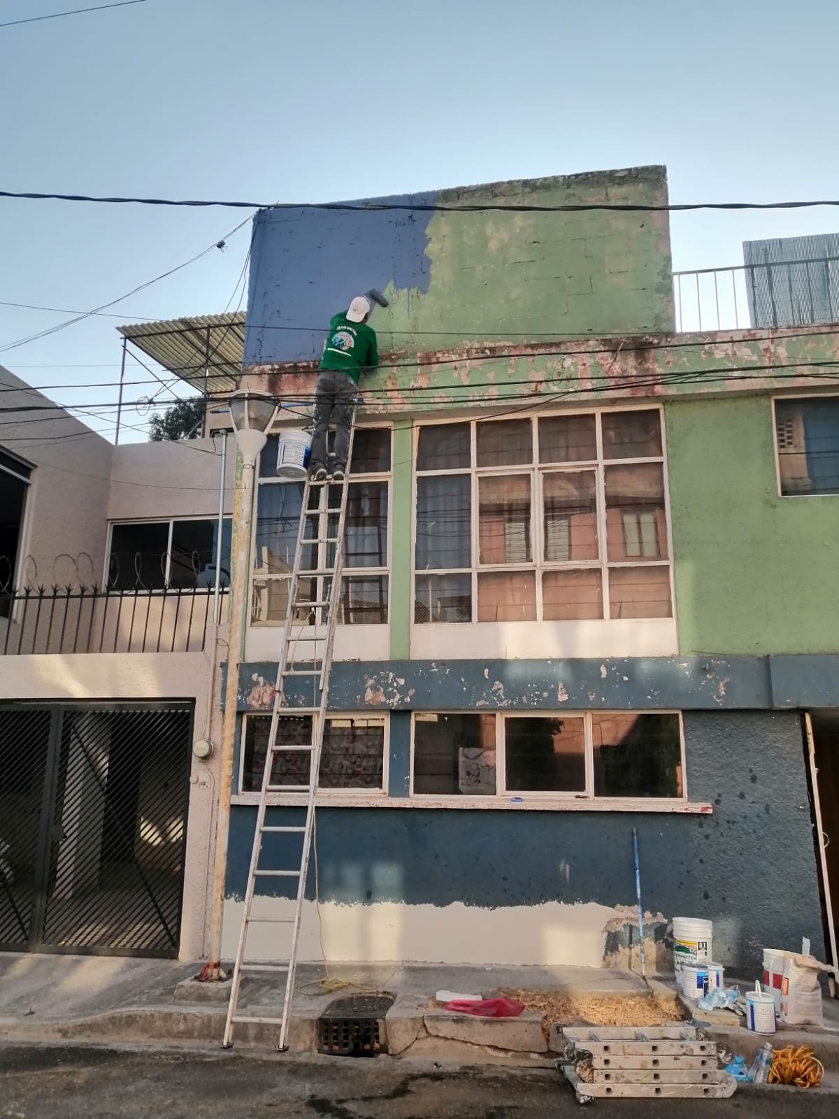• $70 M2 por pintar a dos manos de pintura del mismo color con resanado de paredes leves en exterior con una altura de más de 6 metros.