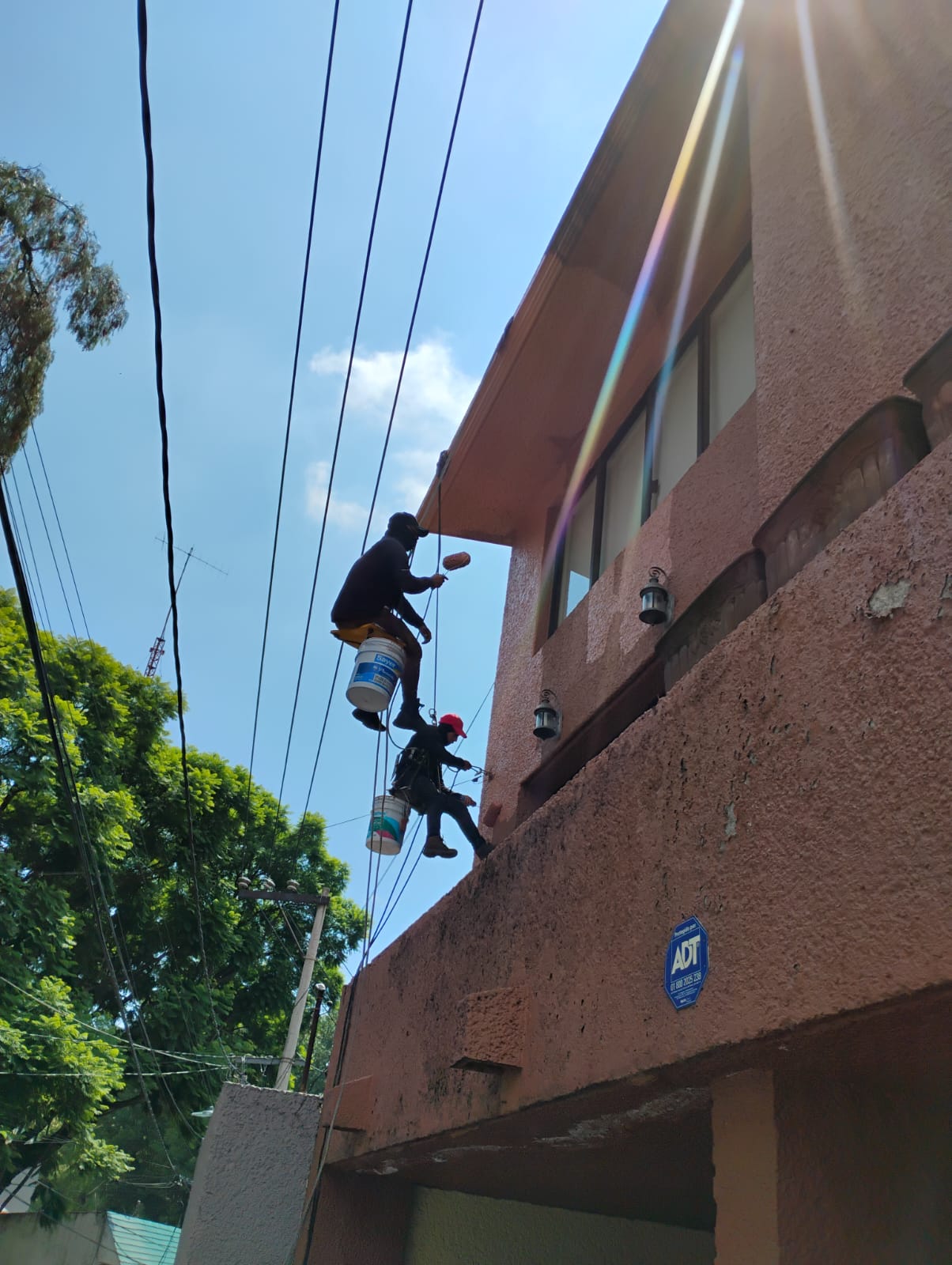 Una vez que ya tenemos todo el equipo necesario antes mencionado para pintar en alturas ahora sí, es el momento de subir a la azotea del edificio a pintar y desde ahí descender un poco para trabajar en la fachada más alta y descender poco a poco para ir pintando lo demás ya con el equipo de seguridad bien colocado en cada pintor de casas, suena fácil pero no es sencillo una vez que estas en lo más alto del edificio debes colocar el cable “tie-off” que este se recomienda por su versatilidad este lo debes colocar en la punto de anclaje que está en los edificios una vez que está conectado se empieza a conectar todo el equipo son dos partes primero se debe instalar la línea de vida con el punto fijo al punto de anclaje de manera segura ahora bien este punto fijo se conecta a la cuerda un sujetador de caídas este cable es recomendable que sea de 90 centimetros al arnés es importante que nunca por ningún motivo se debe de quedar desconectado, ahora se debe de instalar el sistema que te ayudará a descender donde se podrá suspender en el aire lo que este ayudara a los pintores de casas a poder descender con seguridad en la fachada a pintar en cdmx. Ahora si es hora de iniciar se avientan todas las cuerdas al vacío para poder iniciar el descenso del pintor, no se olviden tener listo el descensor donde se recomienda el “DA-A” donde por medio de una palanca con la fricción necesaria les ayudara a descender poco a poco y se debe colocar la Guindola (Andamio volante, armado de tres tablas unidas y colgadas por sus extremos que se abrazan por un palo teniendo forma de banco de madera).